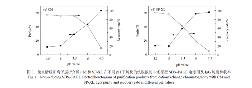 经介质筛选和条件优化,确定了阴离子交换层析介质Q-XL作为分离纯化工艺的介质,经一步纯化得到高纯度鸡白痢沙门氏菌兔抗血清多抗IgG标准物质的最佳pH为5.5,IgG最高纯度达99.3%,回收率达67.5%,总活性收率为62.5%。